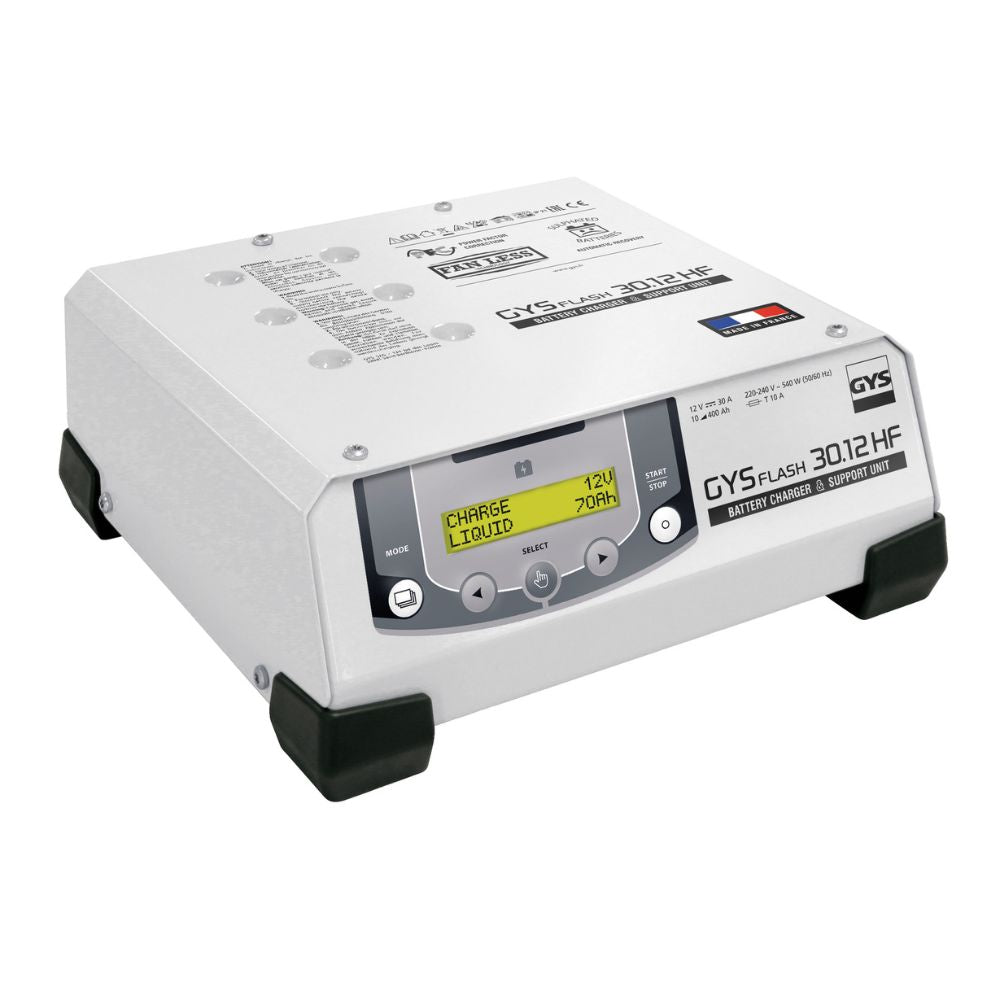 The GYS GYSFLASH 30.12 HF is a versatile 30A high-power stabilised supply unit incorporating advanced inverter technology.