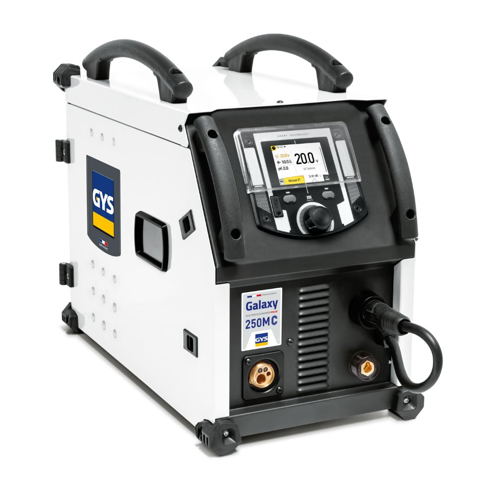 The GYS GALAXY 250M-C is a powerful single-phase, multi-process inverter welder designed for professional workshops and fabrication environments requiring precision and versatility. Featuring pulse and synergic MIG/MAG functions, it delivers exceptional control of the welding arc, reducing spatter and distortion while achieving smooth, high-quality welds on thin aluminium, stainless steel, and steel. This intelligent inverter offers over 40 synergic programs for various materials and wire types, as well as four distinct welding modes — Standard, Pulse, ModulArc, and Manual — ensuring optimal results for every application. Its robust design, advanced digital interface, and full traceability capability (EN 3834 compliant) make it ideal for industrial users seeking a portable, high-precision solution that’s easy to operate and maintain.