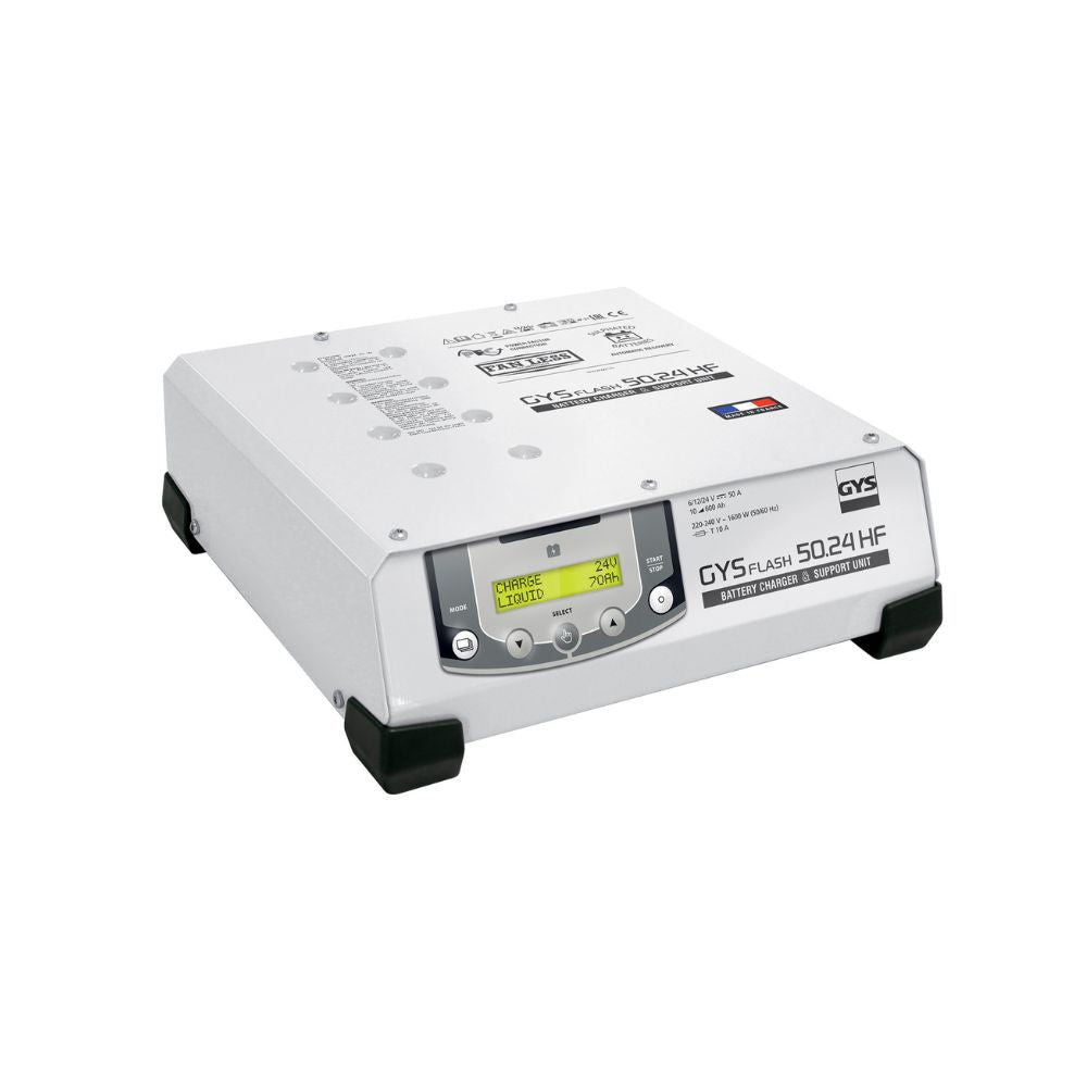 The GYSFLASH 50.24 is a powerful, high-precision inverter-based smart charger and support unit designed for 6V, 12V, and 24V battery systems. Delivering up to 50A at 12V and 45A at 24V, it provides exceptional stability and accuracy for workshop, diagnostic, and showroom use.