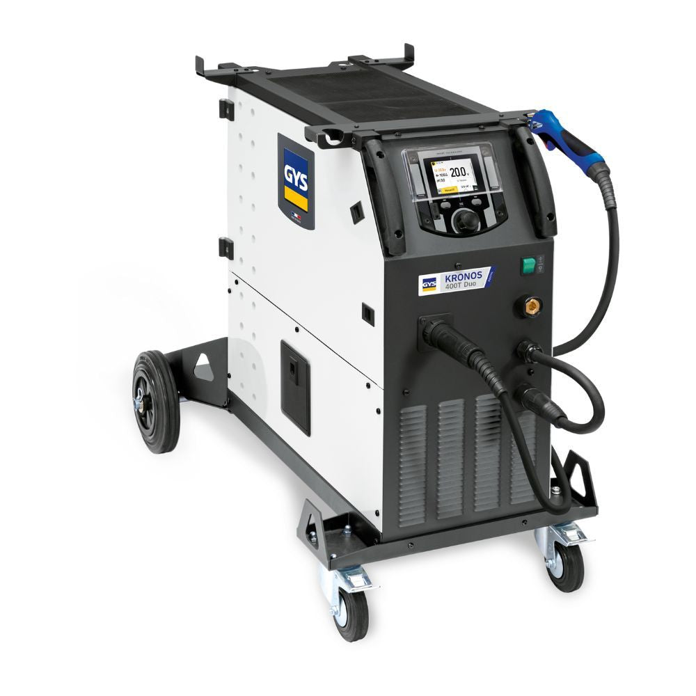 The GYS KRONOS 400T W is a robust three-phase multi-process inverter welder engineered for professional MIG/MAG, TIG DC, and MMA welding. Designed and manufactured in France, this model includes an integrated 800W cooling unit for extended operation and efficiency in demanding industrial environments. Its digital synergy control automatically adjusts welding parameters for different wire types and gases, ensuring consistent weld quality and minimal spatter. With a 3.5” multilingual colour display and intuitive navigation, welders can quickly optimise settings, while the dual operating modes—Easy and Expert—allow both newcomers and experienced professionals to achieve precise results. The KRONOS 400T W delivers exceptional stability, energy efficiency, and versatility, making it ideal for heavy fabrication, automotive repair, and production environments.