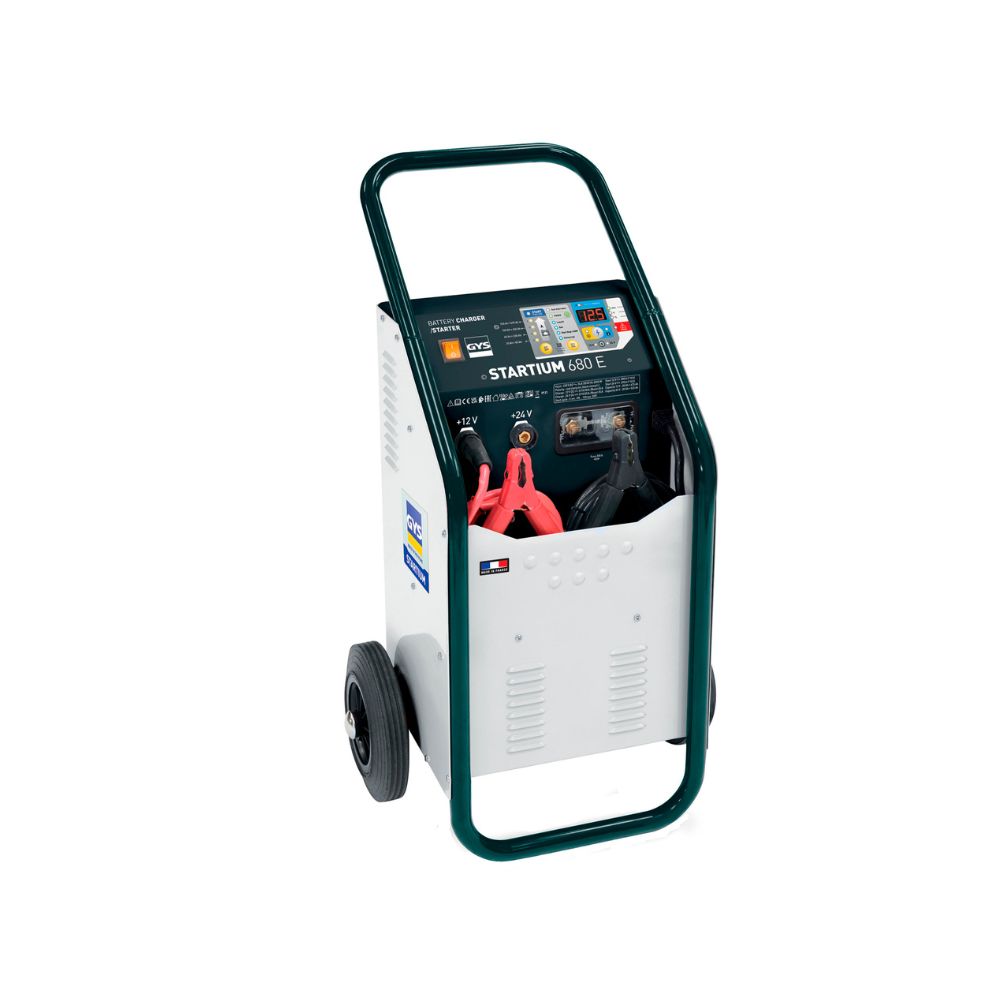 The GYS STARTIUM 680E is a heavy-duty 12V/24V starter charger designed for professional workshops, garages, and fleet service centres requiring a robust, intelligent, and versatile charging solution. Manufactured in France, this high-capacity unit safely charges and starts all AGM, Gel, and liquid lead-acid batteries, including modern Stop/Start systems. It features advanced microprocessor control that analyses battery health in real time and automatically adjusts voltage and current for safe, efficient operation. The 680E includes four charge modes (5A, 15A, 30A, 45A boost), smart start protection, alternator testing, SOS recovery for sulphated batteries, and a fault display for easy diagnostics. Compact yet powerful, it delivers up to 380A start current at 12V and 270A at 24V, making it suitable for cars, vans, and light commercial vehicles.