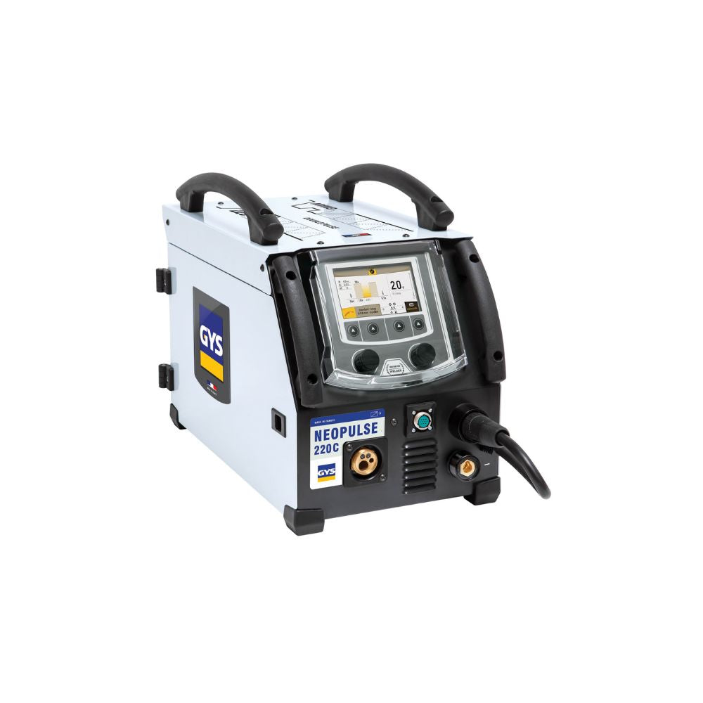 The GYS NEOPULSE 220C is a powerful single-phase pulse MIG/MAG inverter engineered for professional welding performance across multiple processes including MIG/MAG, MMA, and TIG DC Lift/Pulse. Built with digital control and four microprocessors, it offers four times the processing power for precise arc control, exceptional welding quality, and enhanced productivity. Its intuitive digital interface and synergic mode make setup simple: select material, gas, and wire diameter, and the machine automatically calculates optimal parameters while allowing manual fine-tuning. The NEOPULSE 220C supports six MIG/MAG welding modes, stores up to 500 welding programs, and provides full traceability in compliance with EN ISO 3834. Encased in a durable metal housing with IP23S protection, dual handles, and a 4-roller drive system, this welder is ideal for demanding workshop and industrial applications where precision and reliability are critical.