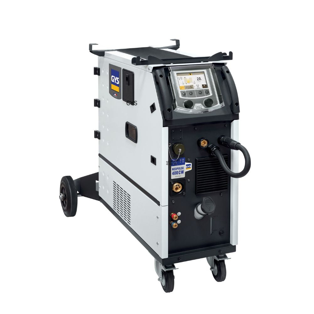 The GYS NEOPULSE 400 CW is a robust, three-phase pulsed MIG/MAG inverter designed for high-performance industrial welding applications. Delivering a powerful 400 A at 60% duty cycle, it is ideal for continuous, heavy-duty fabrication of steel, stainless steel, aluminium, and CuSi/CuAl alloys. This advanced machine features four microprocessors for superior process control, enhanced arc stability, and high-speed communication. It offers six MIG/MAG modes — Standard Dynamic, Standard Impact, Standard Root, Pulsed, Modularc, and Manual — ensuring versatility for every application. Built with an integrated cooling unit and a durable IP23-rated chassis, the NEOPULSE 400 CW is perfectly suited to harsh workshop and industrial environments. Its intuitive digital interface with synergic control automatically determines optimal parameters, while allowing fine-tuned adjustments for professional precision and maximum productivity.